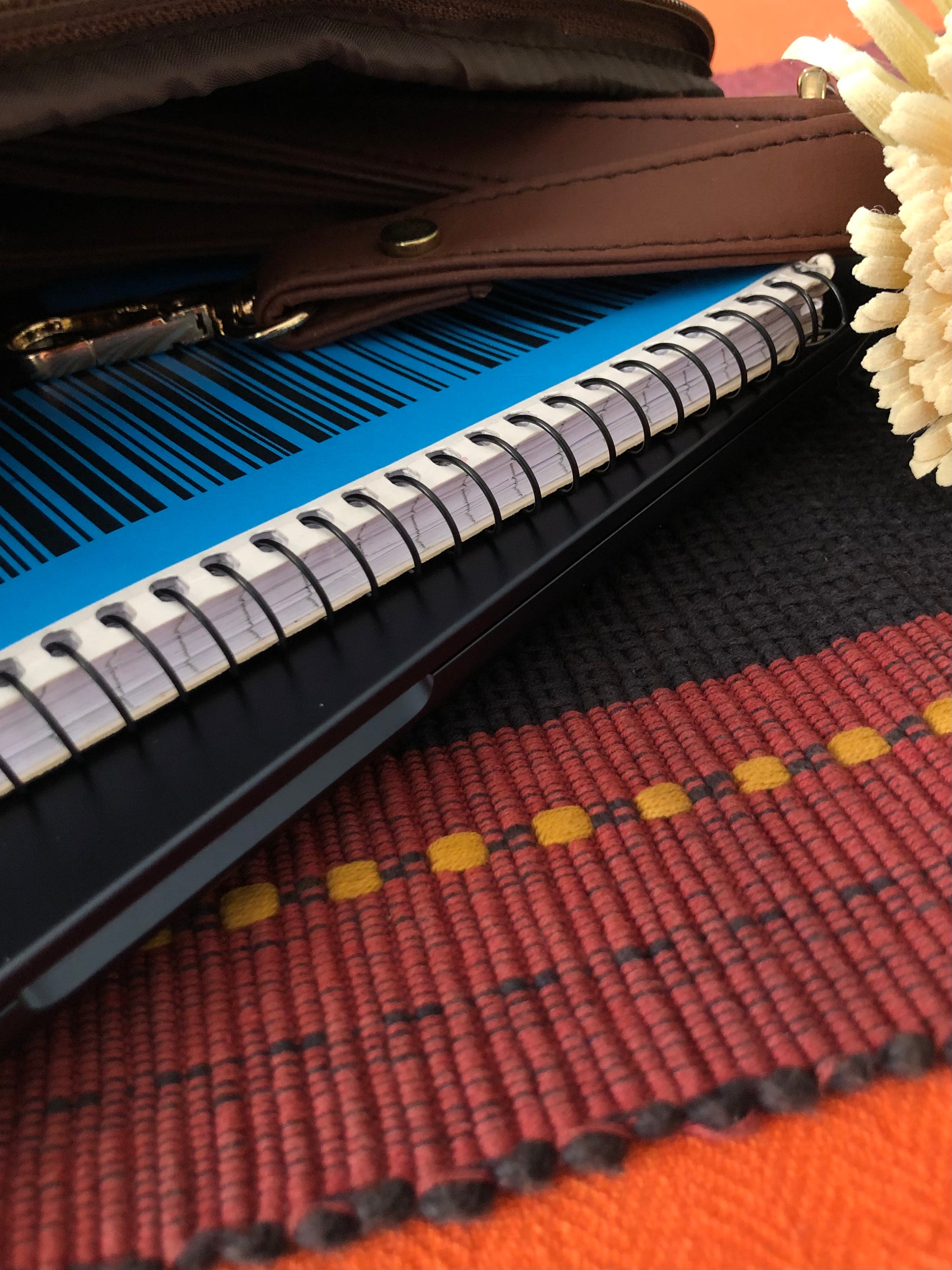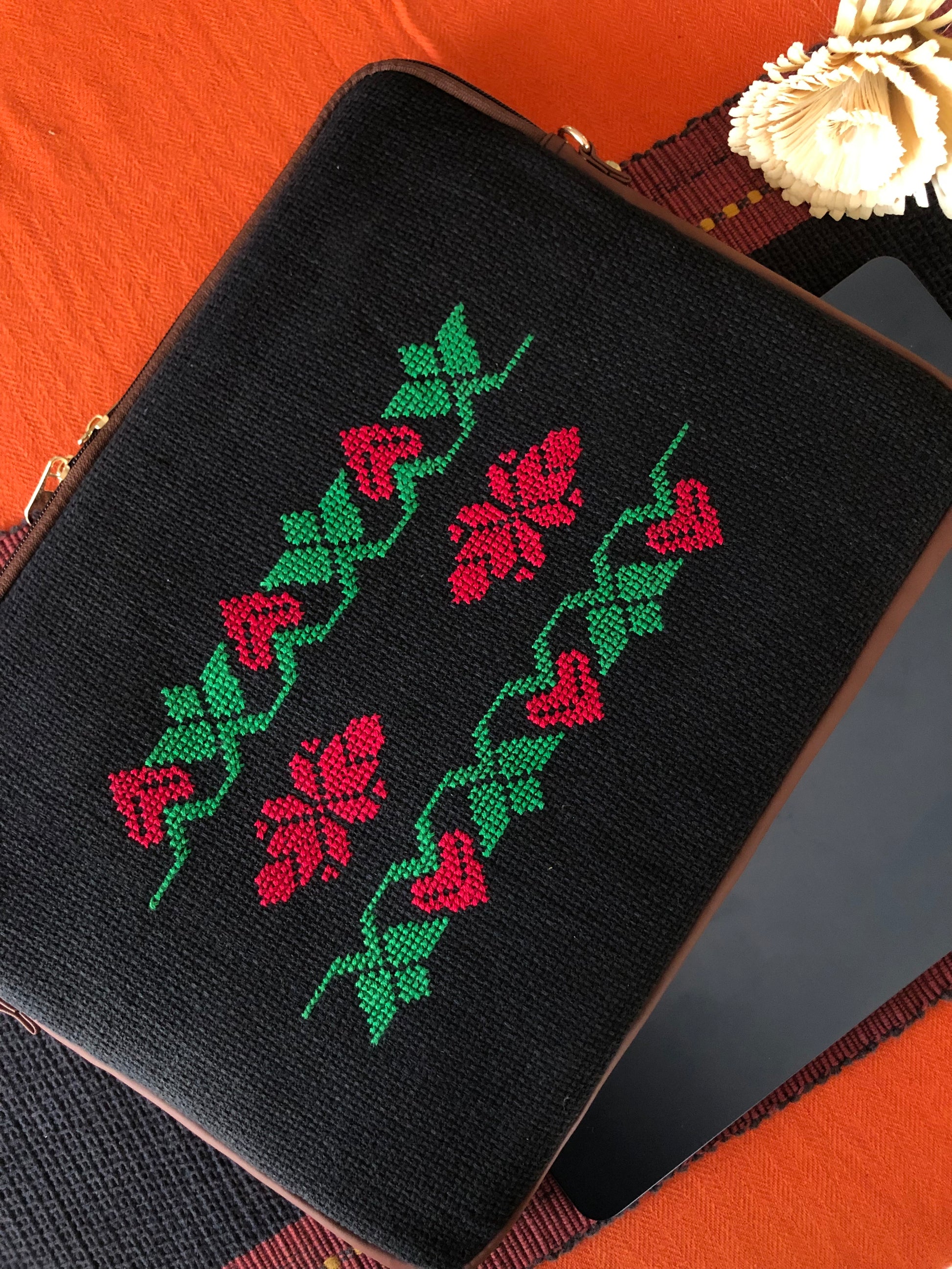 An embroidered laptop sleeve with Assamese motifs, perfect for a 15" laptop, with two interior compartments that comfortably hold your computer, a notebook, and a pen. The back is plain and made of rexene, and the sleeve includes a long strap for easy over-the-shoulder carrying.