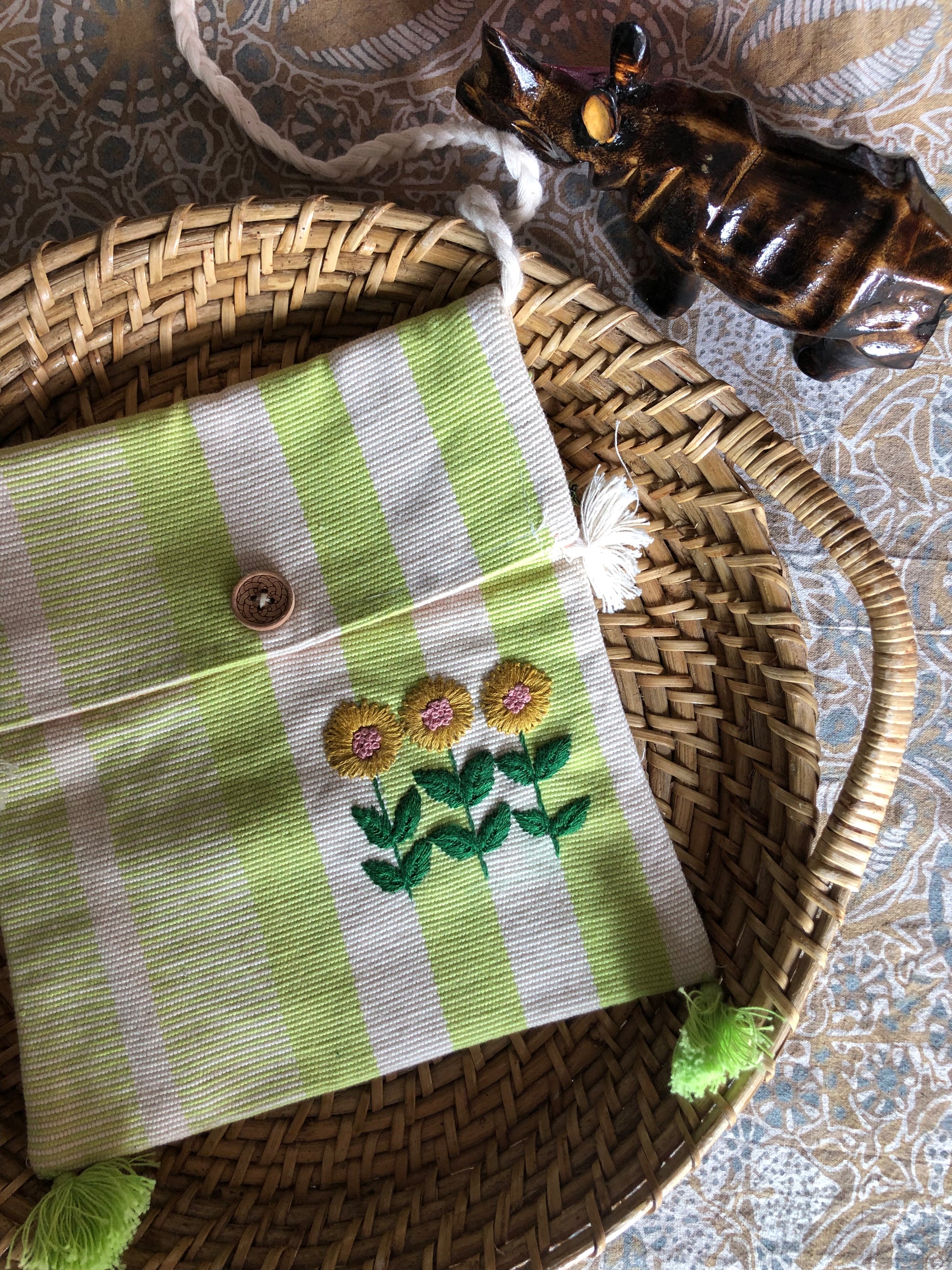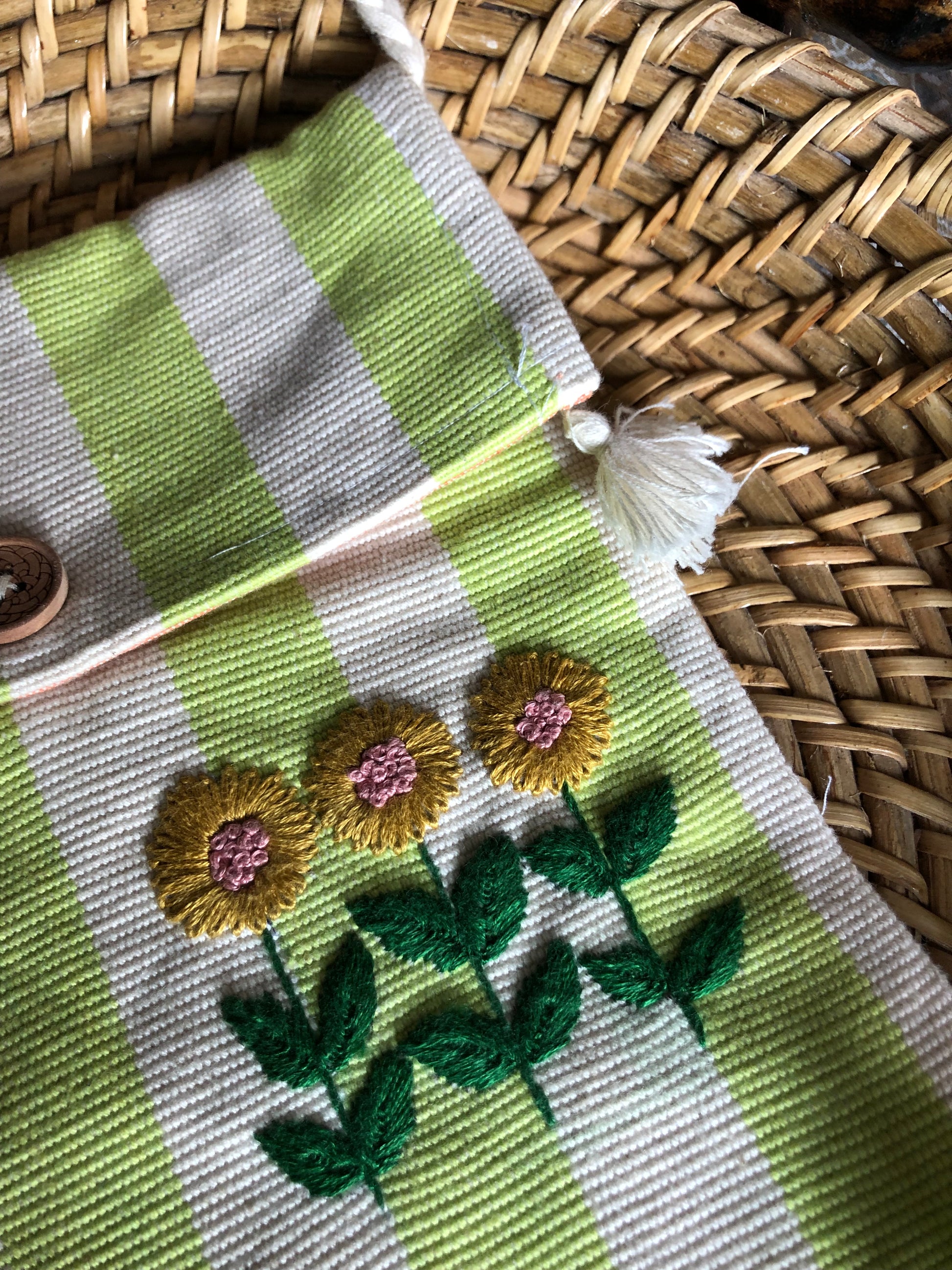 A simple motif embroidered on a lightweight sling bag hand woven by Bodo women from Darrang.